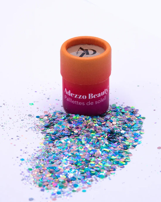 Paillettes biodégradables, 100% sans plastique. Designées en Provence. Pour un maquillage festif : visage, cheveux, corps.